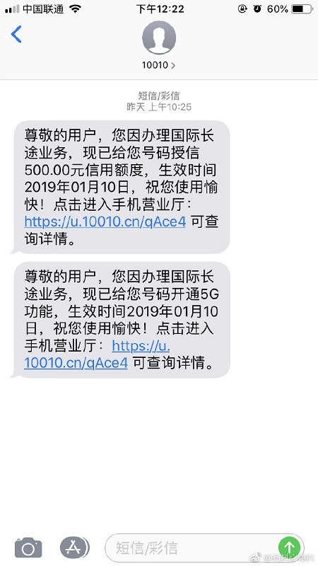 用户晒出的短信截图显示,因为其办理了国际长途业务,因此联通为其开通了5G功能,生效时间是1月10日。
