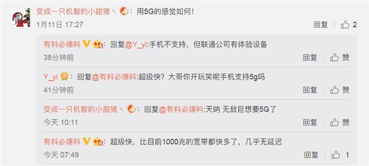 另外该用户在微博下方的评论中提到,虽然目前还没有5G手机,但联通公司有体验设备,网速“比目前1000兆的宽带都快多了,几乎无延迟”、“5G下载速度比4G速度快40-60倍”,并表示湖南长沙这边联通已经覆盖了5G。
